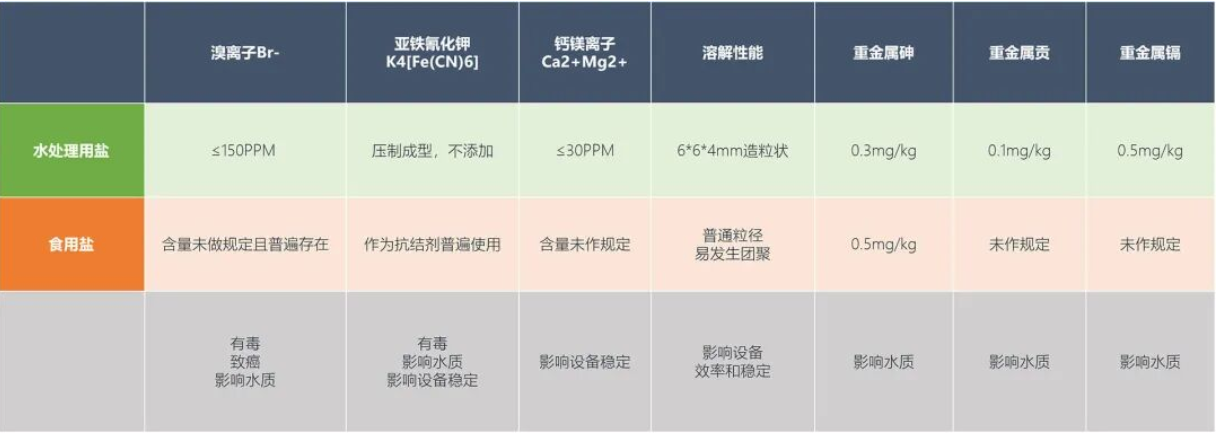 水處理用鹽相對于食用鹽,其鈣鎂離子含量、亞鐵氰化鉀含量、溶解性能方面都有嚴格的規定,有利于設備的穩定運行,降低設備日常維護的成本。